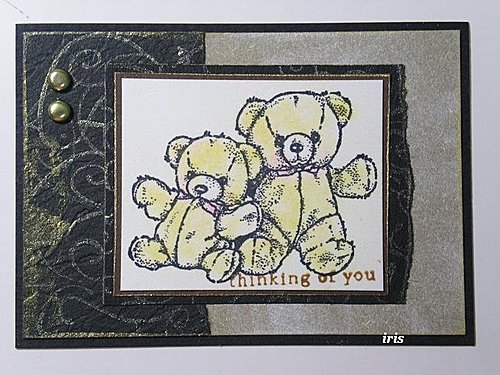 有很長一段時間沒玩熊熊印章了,這類印章都是為小朋友買的,家裡的幾顆PSX熊印章也不知塞哪裡去了,後來小朋友喜歡恐龍,海盜,萬聖節,飛機,藏寶圖,美國國旗之類的,更把熊熊印章忘的徹底。不過這次美日出的熊熊家族,乍看之下實在引不起我的興趣,但為了工作還是把它拿來玩玩,蓋出來效果還不錯喔,而且他做的小小的(約G章,F章)剛好適合ATC,這幾張是在櫃位上做的,材料有限,所以簡單做..........字又蓋歪了